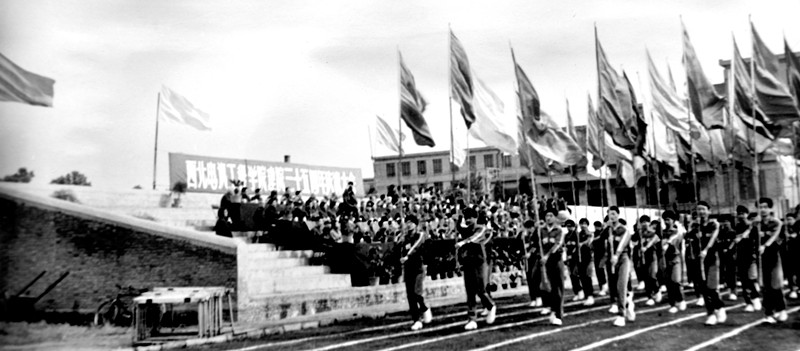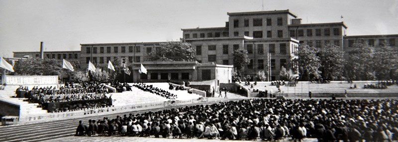 70年代建起了半边看台将大操场一分为二,学校在这里举行了校庆35周年大会,这是大会主席台
