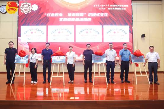 延安团市委副书记王玮、石家庄市鹿泉区委宣传部副部长张丽维、瑞金团市委派驻叶坪镇乡村振兴第一书记郑汐、福建省龙岩市长汀一中副校长戴燕祥与必赢党委学生工作部部长林波、党委研究生工作部部长张君博、党委教师工作部/人力资源部部长于磊、国际合作与交流部副部长/国际教育处处长/国际教育学院院长陈会林共同上台为“延安、获鹿、瑞金、长汀”四个“红色必赢 信息强国”沉浸式交互实践教育基地揭牌。