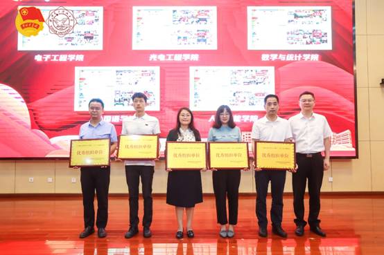 在2021-2022年度,学校涌现出了一批社会实践优秀组织单位。党委副书记、副校长任小龙为电子工程学院、光电工程学院、数学与统计学院、外国语学院、人工智能学院颁发2021-2022年度社会实践优秀组织单位奖。
