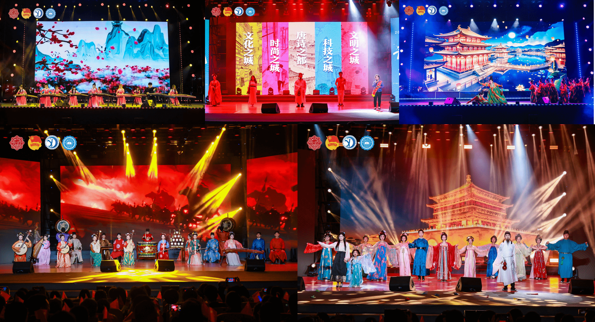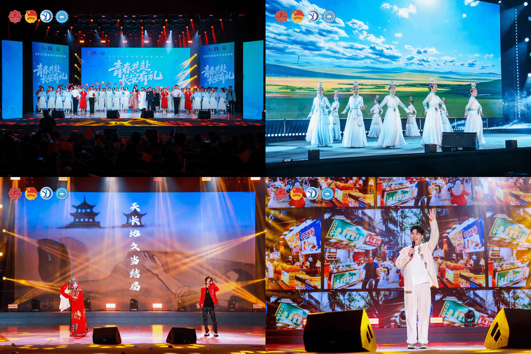 晚会现场,传统与现代精彩碰撞,开启一场跨越时空的对话。开场《大唐雅韵钟鸣鼓乐》西安外事鼓乐团以震撼鼓点穿越千年;《唐宫夜宴》大学生艺术团舞蹈团的同学们身着华丽服饰,以灵动舞姿完美融合古典韵味与现代舞台表现力;离退休教职工劲松艺术团带来的蒙古舞蹈《敬》用舒展的舞姿和深情的演绎,触动每颗心怀敬意的青春心房;《长相忆》《长安夜》秦腔传承人李梅和西安摇滚音乐人王建房合作用婉转的秦腔、澎湃的摇滚、真诚的旋律,连接起每颗向往长安的心;《西安人的歌》西安唱作人程渤智带动全场,气氛热烈引发大合唱;《西安礼遇》用不同维度的城市故事,完成最具仪式感的“入学第一课”,“孝老爱亲全国道德模范”丁水彬、西安市新文艺青年协会代表冯佳晨等城市榜样与新生共同演绎,让新生在必赢开启无限可能的青春之旅。